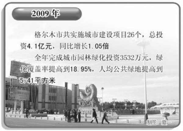 2009年,格尔木市扶持资金保障有力,累计争取公铁分流、节能减排等资金1.1亿元,中小企业担保平台扶持资金475万元;安排中小企业“孵化器”建设资金4000万元;落实政府信用贷款11.38亿元,到位9.14亿元,同比增长5倍。全市规模以上工业企业达到48个,实现利润38.6亿元,工业对GDP增长的贡献率为73.2%,拉动GDP增长14个百分点。 “十一五”以来,格尔木市财政用于城市外围绿化和生态的投资达到了8526万元,是“十五”总投入的13.1倍;城市园林绿化建设的投入达到了1.23亿元,是“十五”总投入的2.3倍;国家重点公益林的投入达3526.8万元,是“十五”总投资的4.2倍。